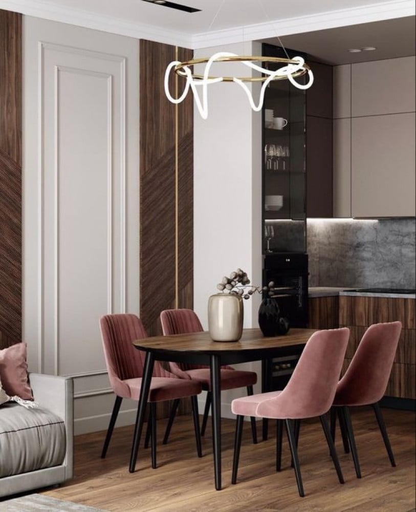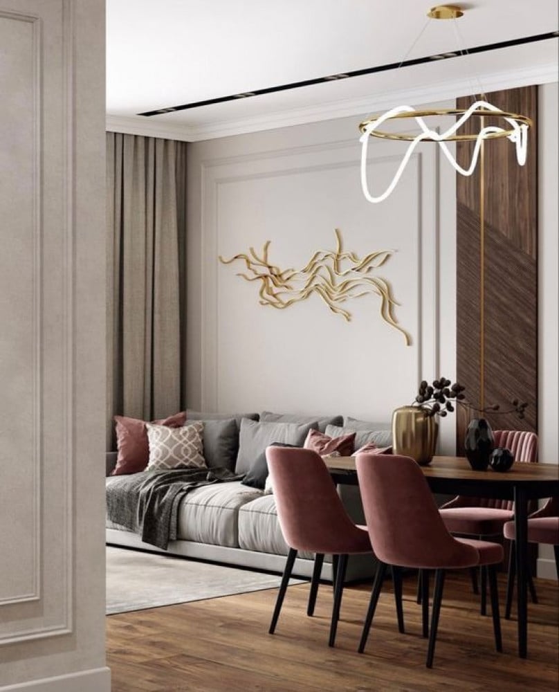 تضفي هذه الثريا لمسة فنية حديثة على ديكور أي مساحة، بفضل شكلها الدائري المميز والتشطيب الذهبي الراقي.