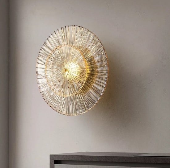 من أجمل أنواع اضاءة مطابخ حديثة​ وتستخدم لإضافة لمسة جمالية وأنيقة مثل إضاءة جدارية زجاجية مزخرفة حيث تمثل عنصر زخرفي ينثر الجمال في المكان، ويضفي المصباح رونقًا فريدًا على الجدران بفضل تصميمه الزجاجي الدائري، مما يجعله الخيار المثالي لإبراز جمال أي مكان.