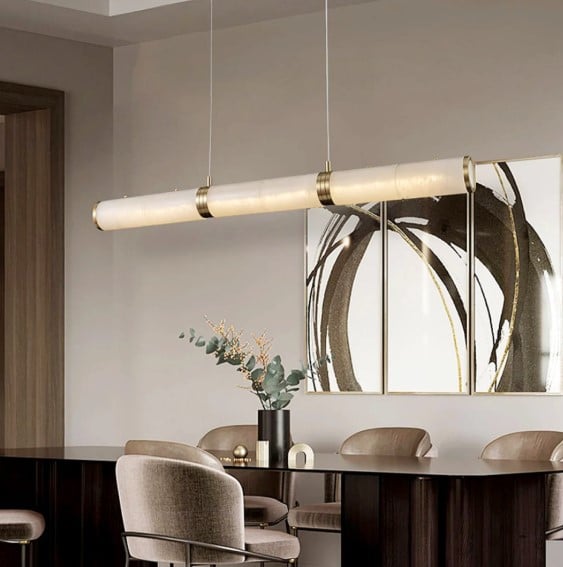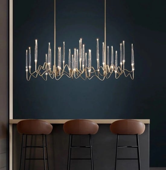 مثل التصاميم التي تأخذ شكل الأغصان أو الزهور أو قطرات الماء، وتمنح الصالة طابعًا فنيًا جذابًا مثل ثريا معلقة طولية من الرخام الأسباني من متجر لكس.