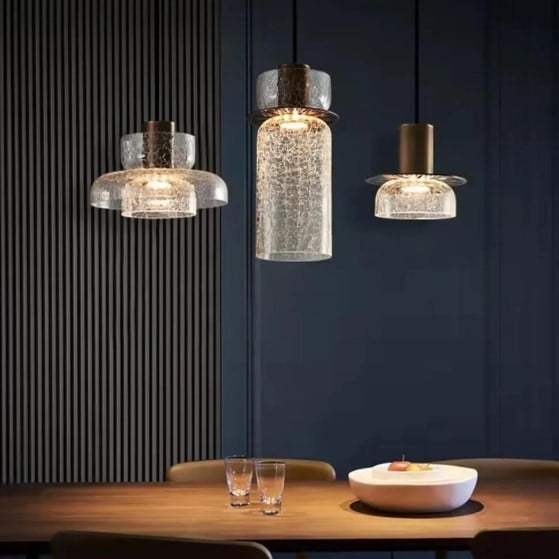 تمزج بين المعدن اللامع والكريستال الشفاف لتكوين تصميم عصري يناسب الصالات الحديثة ذات الأثاث البسيط والخطوط النظيفة مثل إضاءة معلقة من الزجاج والمعدن من متجر لكس.