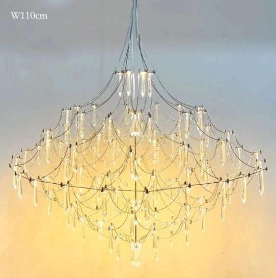 الثريات الطويلة هي الخيار المثالي للأسقف العالية والمداخل الممتدة على طابقين وتتدلى من الأعلى في خطوط متدرجة أو حلقات دائرية متتابعة مثل ثريا كريستال مع فضي مما يمنح إحساسًا بالعمق والحركة، وتوفر إضاءة فنية تضيف أجواءً درامية فاخرة خصوصًا في مشاريع الفلل أو الفنادق.